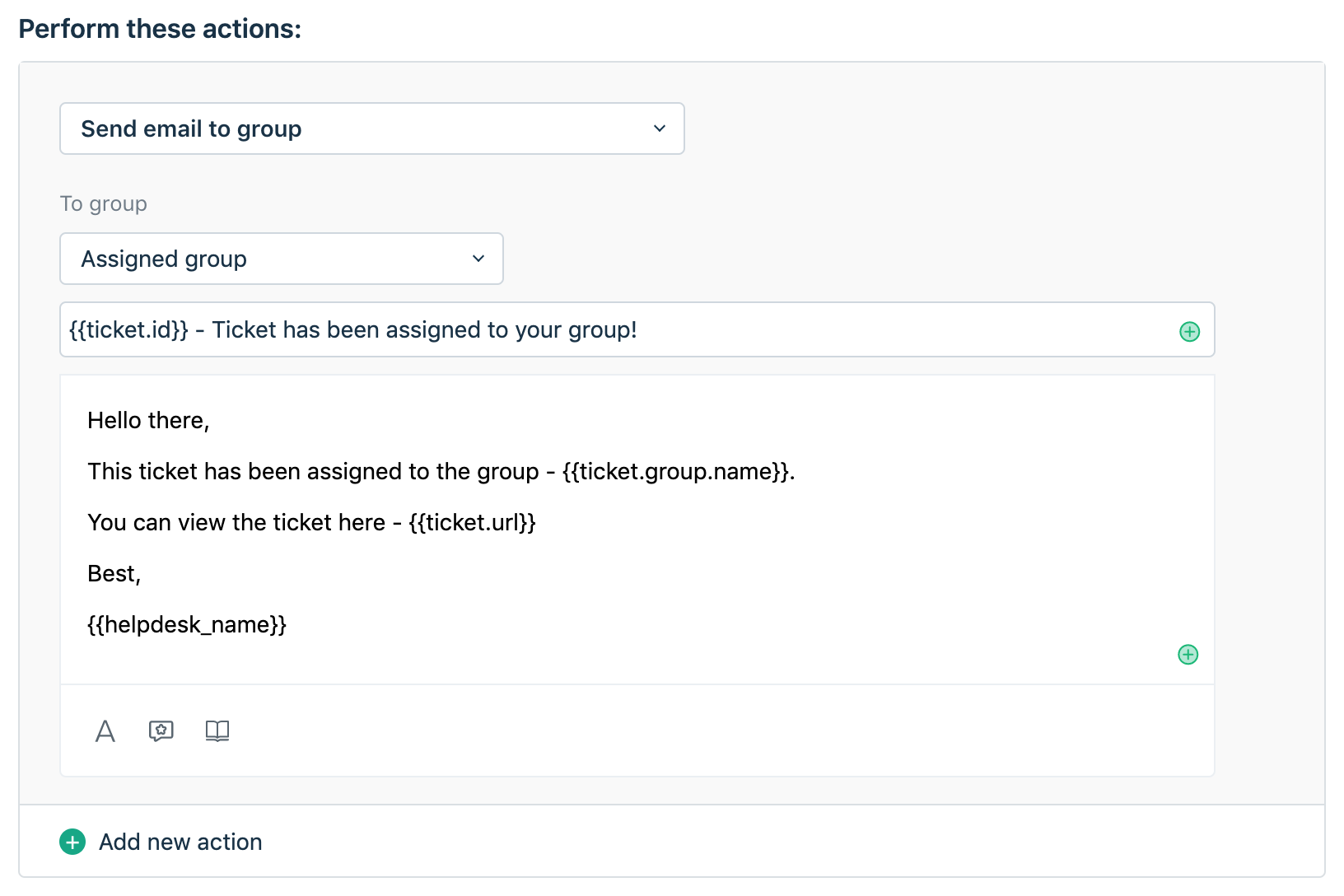 Biletleri bir gruba atamak için ilk açılır menüden Gruba Ata'yı seçin ve sonraki açılır menüden grubun adını seçin. Açılır listeden bir eylem seçerek gerçekleştirmek istediğiniz görevleri ekleyin (gerekirse daha fazlasını eklemek için Yeni eylem ekle'ye tıklayın).