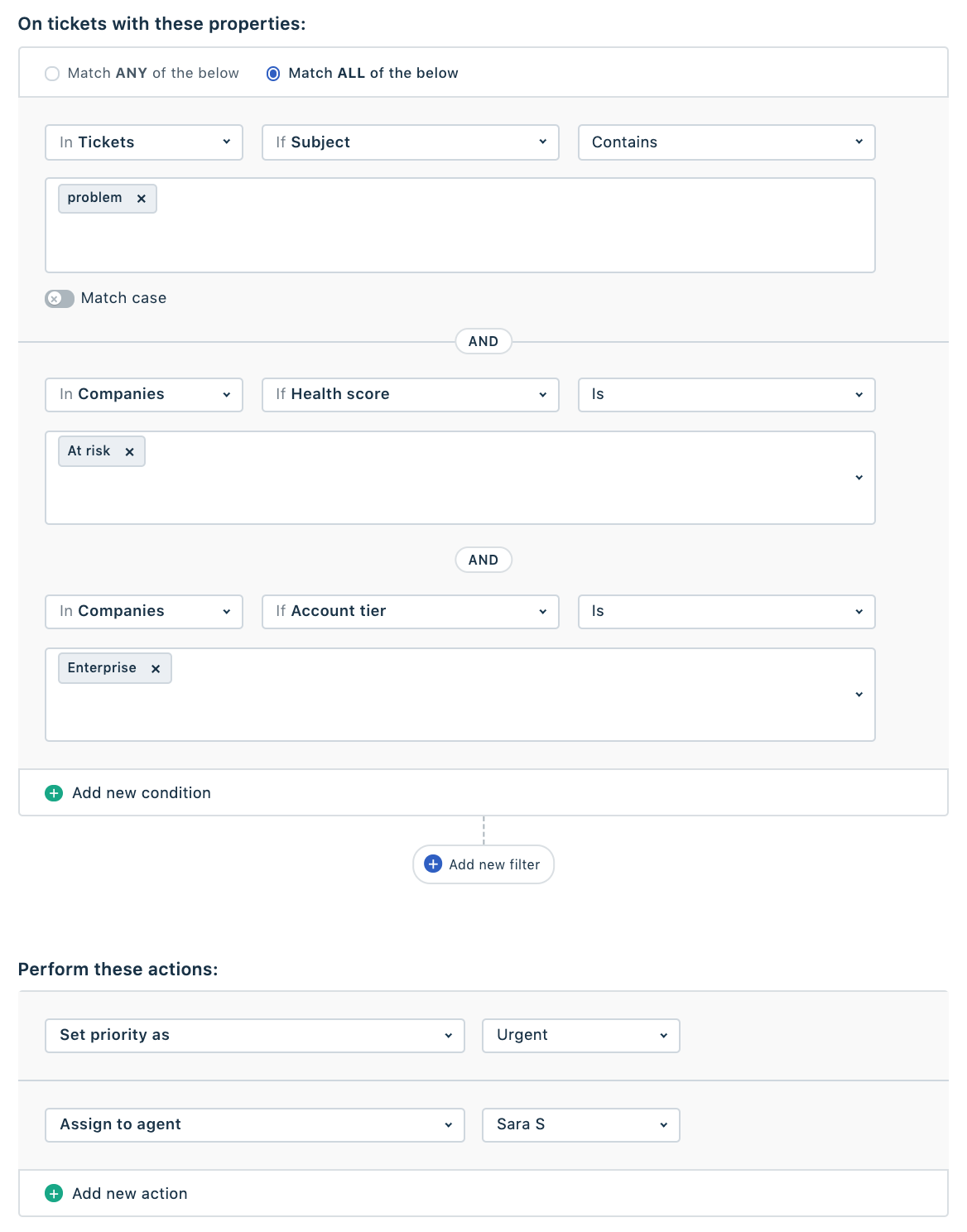 Örneğin, yüksek gelirli mutsuz müşterilerden gelen tüm biletleri filtreleyen, durumlarını Acil olarak ayarlayan ve bunları belirli bir temsilciye atayan bir kural var.