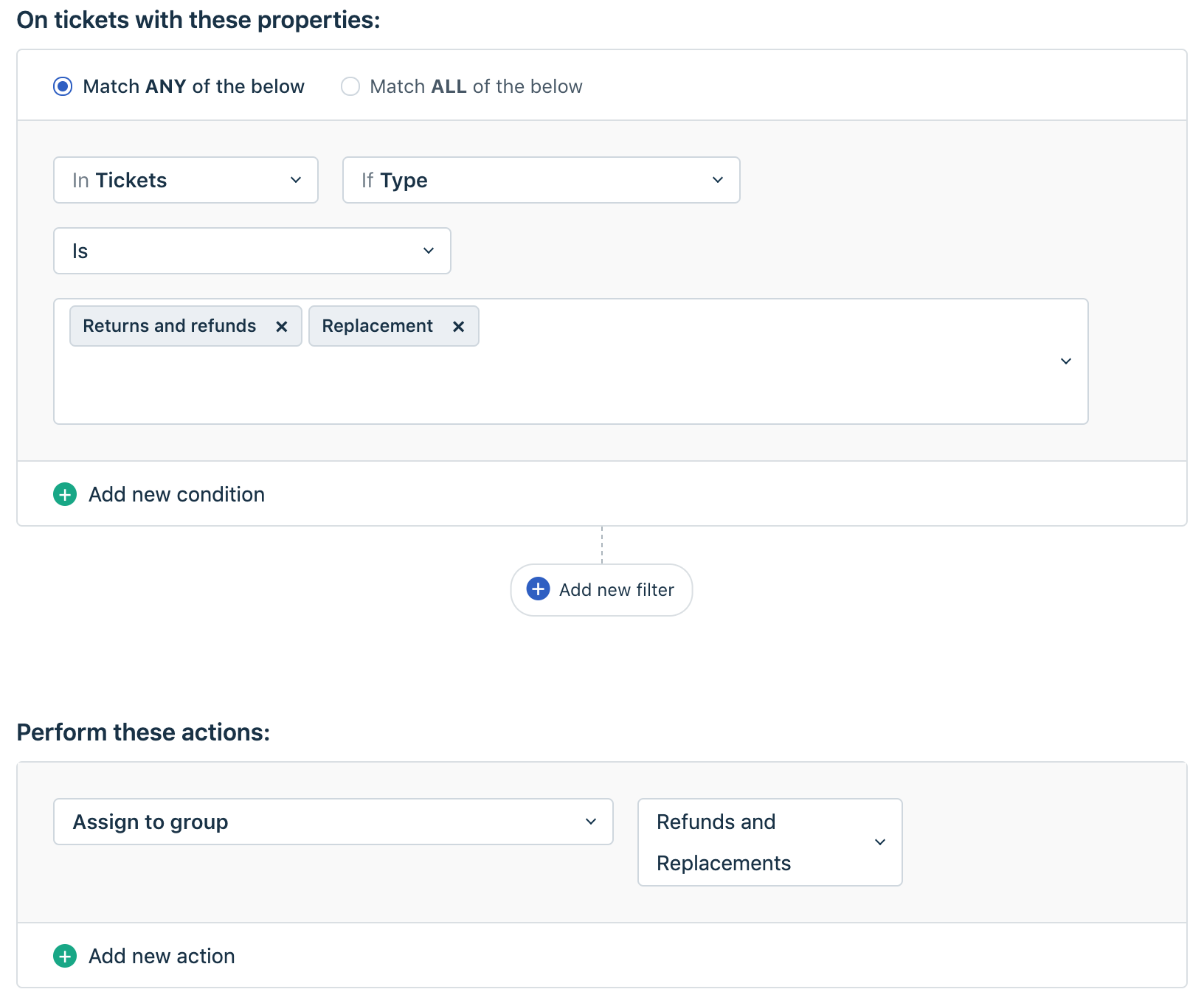 'İade', 'geri ödeme' veya 'değiştirme' türündeki tüm biletlerin İade ve İadeler grubuna atanmasını istediğinizi varsayalım, kuralı aşağıda gösterildiği gibi yapılandırabilirsiniz: