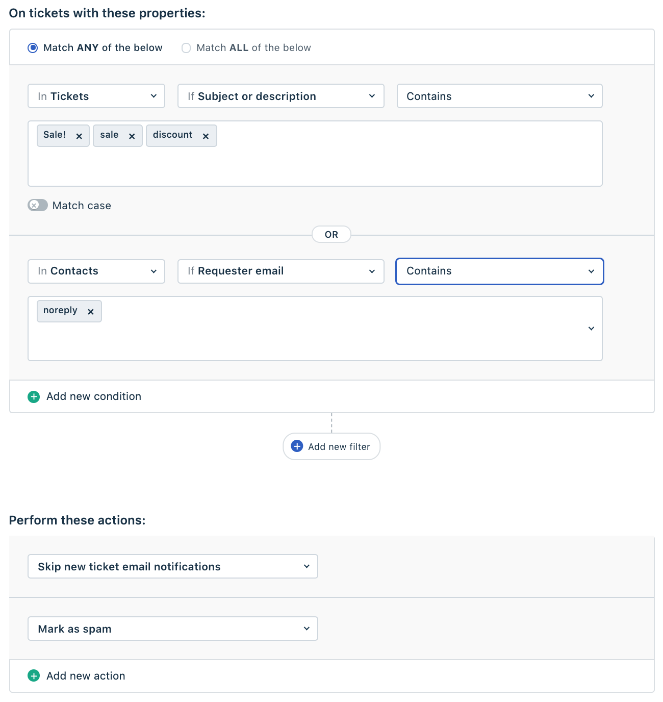 Örneğin, yanıt vermeyen e-posta adreslerinden reklam veya broşür niteliğinde birden fazla destek talebi almanız durumunda, bunları kapatıp otomatik olarak spam olarak işaretlemek ve aynı zamanda temsilcilerinizin, aşağıdaki bildirimi belirten bildirim e-postasıyla spam gönderilmediğinden emin olmak isteyeceksiniz. yeni bir bilet oluşturulduğunu söyledi. Bu durumda aşağıda gösterilen konfigürasyonu kullanabilirsiniz: