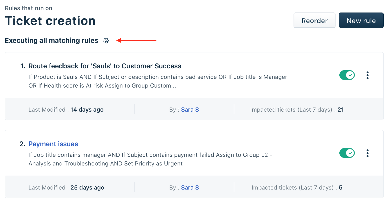 Kurallar, eşleşen her kural üzerinde çalıştırıldığında şu şekilde çalışır. Biletlerinizde tüm eşleştirme kurallarının uygulanmasını istiyorsanız, kurallar listesinin üzerindeki dişli düğmesine tıklayın ve ardından ' Tüm eşleştirme kurallarını yürüt ' seçeneğini seçin. Kaydet'e tıklayın .