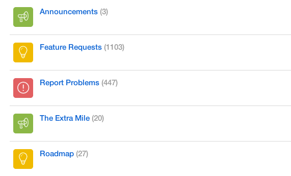 Forumlar benzer konulardan oluşan koleksiyonlardır; böylece müşteriler topluluktan belirli bir yanıt almak için tam olarak nereye gideceklerini bilirler. Örneğin, müşterilerinizden Özellik İstekleri toplamak için özel bir foruma, topluluğun ipuçlarını ve püf noktalarını paylaşabileceği başka bir foruma ve müşterilerin karşılaştıkları sorunlar ve çözüm yolları hakkında konuşabilecekleri üçüncü bir foruma sahip olabilirsiniz.